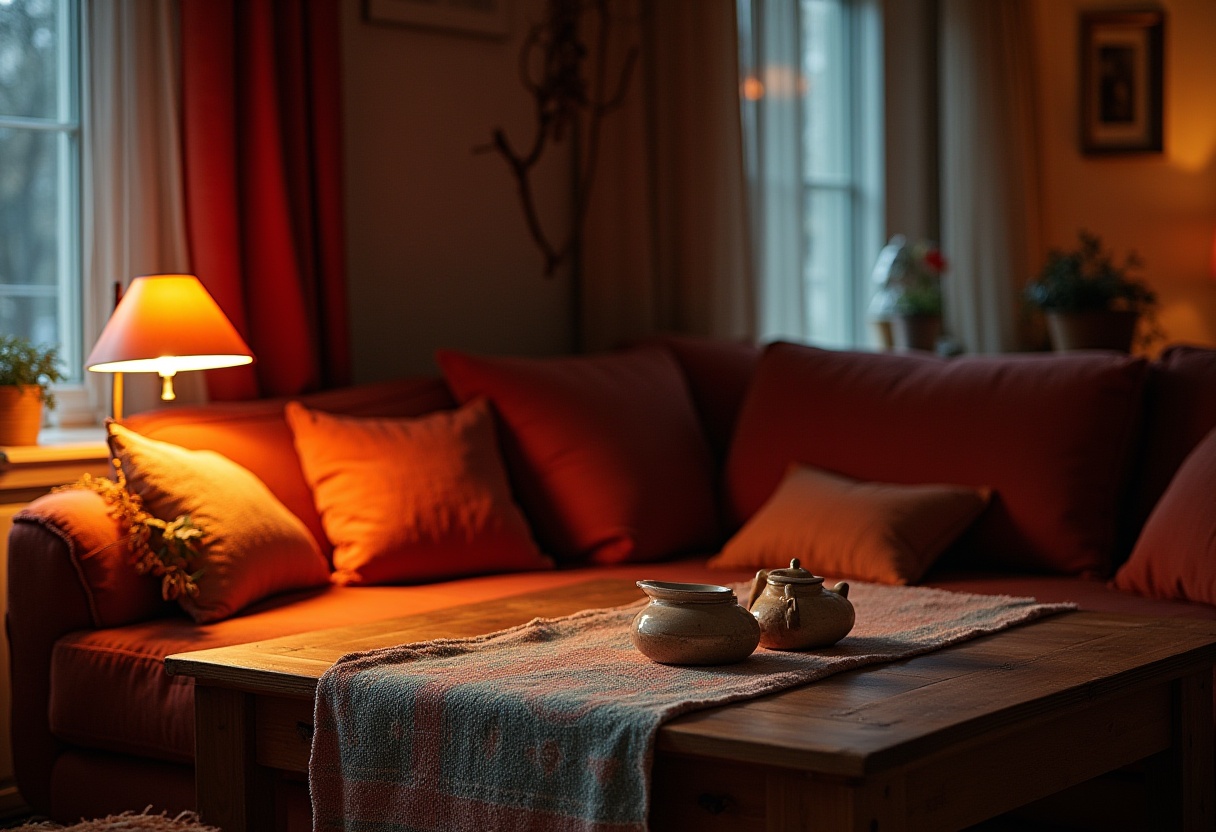 Топли лампи, ароматни свещи (ванилия/канела) и дискретни дифузери завършват есенното усещане. Избери 2–3 източника на светлина на различна височина – настолна лампа, стоящ лампион и свещ на масичката.
