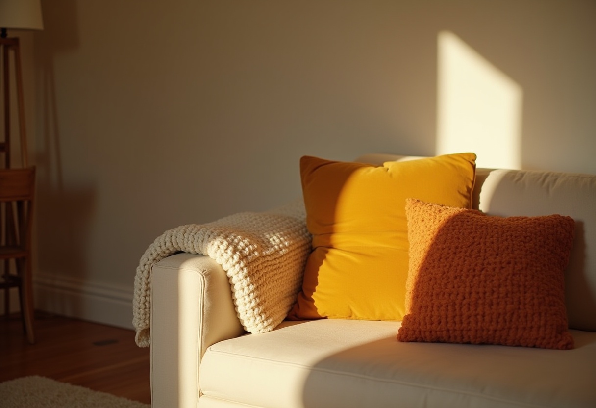 едноцветни декоративни калъфки в 1–2 акцентни цвята. Сменяш само калъфките – ефектът е като нов диван.