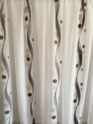 Полупрозрачни пердета, които са готови за окачване с елегантни везани цвятя, артистични. Подходящи са за дневна, кухня и за трапезария - пропускат светлината и не прозират в светлата част на деня. Пердетата са подходящи и за окачване без да са монтирани щори.