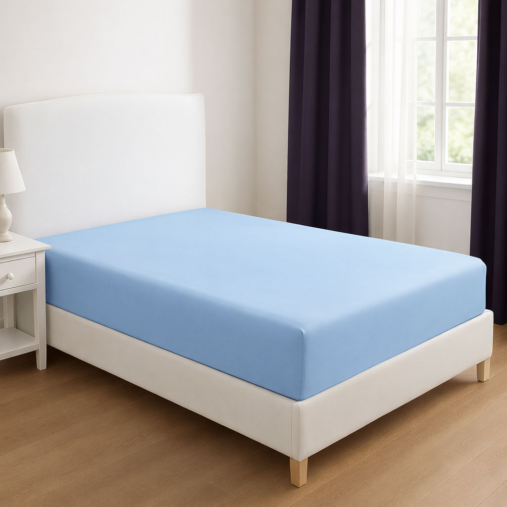 Едноцветните небесносини памучни чаршафи се съчетават с различен тип калъфки за възглавници и пликове.