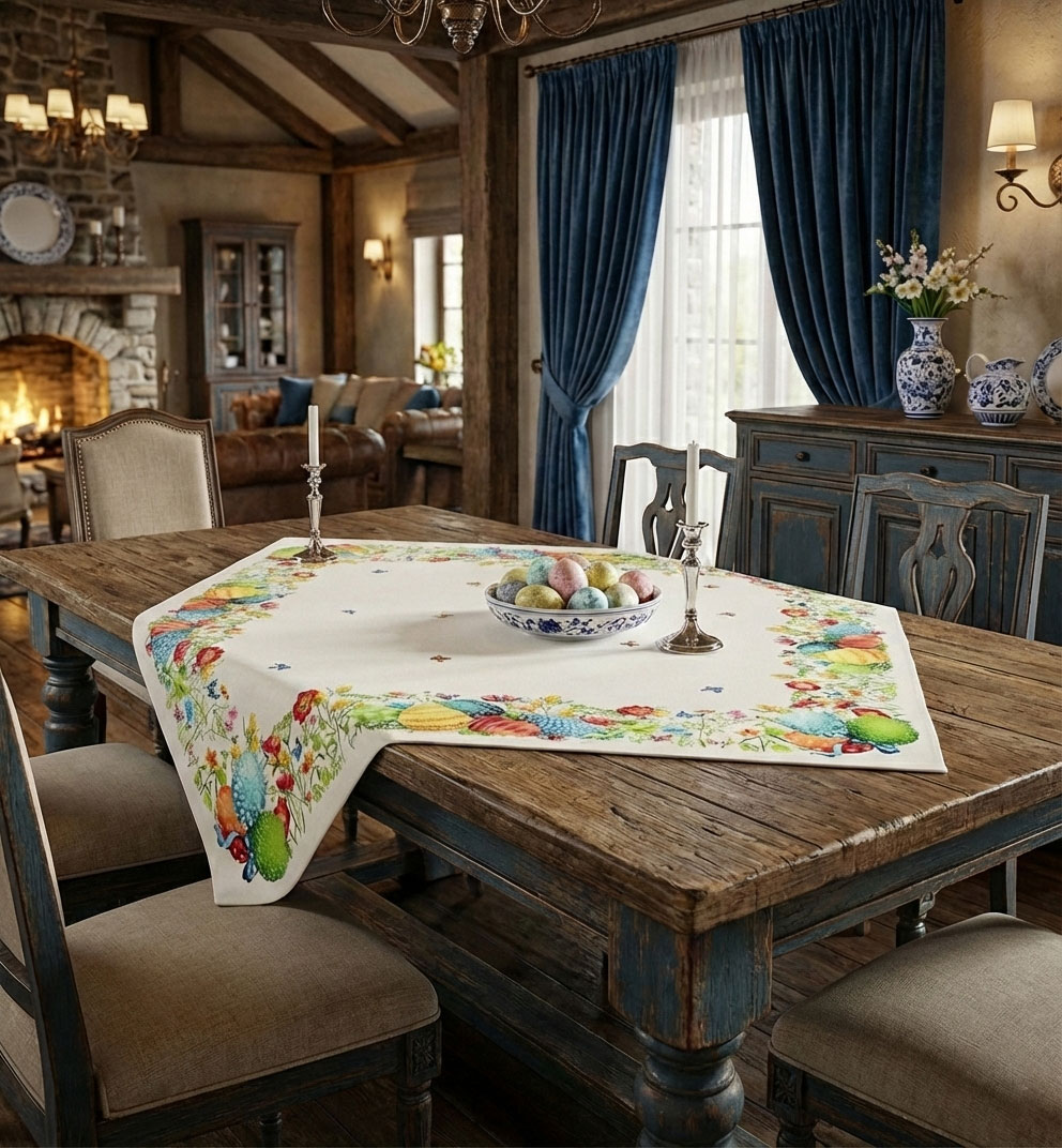 Комбинира се отлично със салфетки от плат в неутрални тонове, тишлайфери в същия или сходен десен, с едноцветни покривки. Подходящо е както за семейни празници, за къщи за гости, бутикови хотели и ресторанти, които държат на автентична великденска атмосфера и визуална хармония.