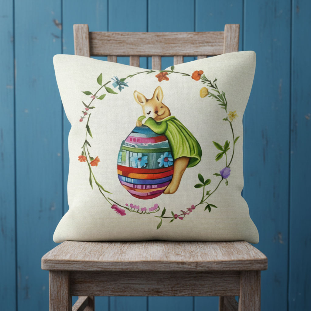 Красиви великденски калъфки в цветовете на пролетта. Венец от пролетни цветя нежно обгръща Зайка и Голямото великденско яйце. Картината е чудесна и е подходяща както за хол и дневна, така и за детска стая.