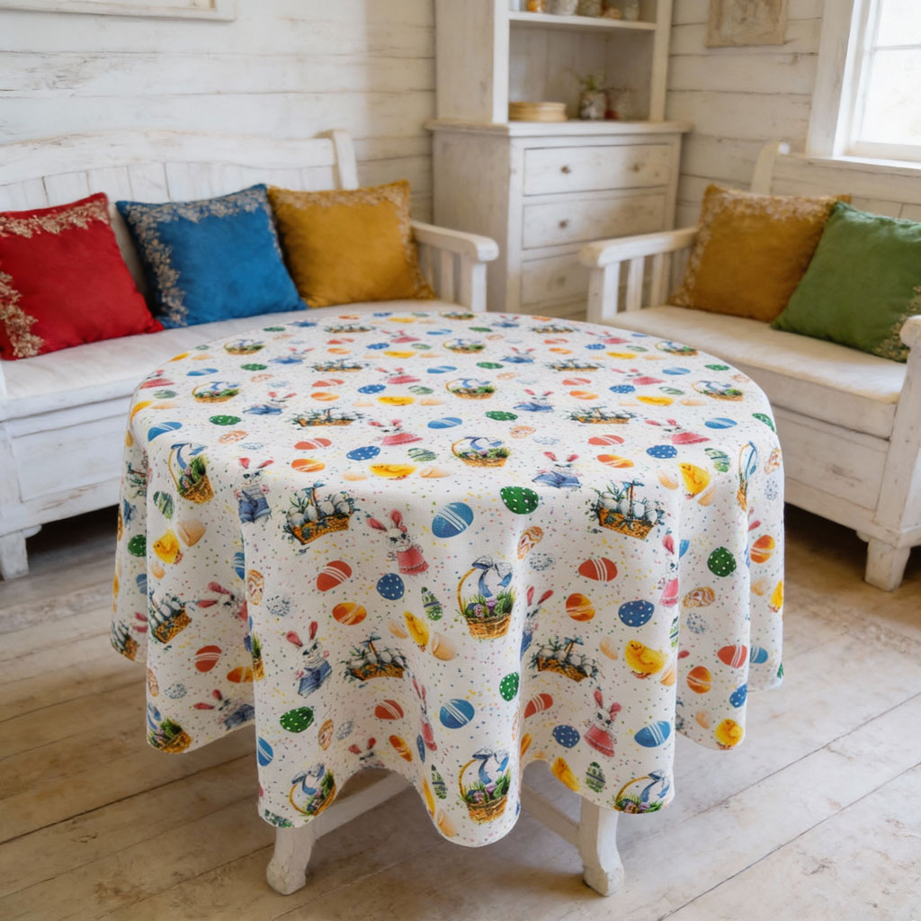 Комбинирайте великденските покривки за маса с тишлайфер и салфетки в един от цветовете. Украсете масата с цяло цъфнало клонче, лалета или нарциси. Сложете кошничка с боядисани яйца.