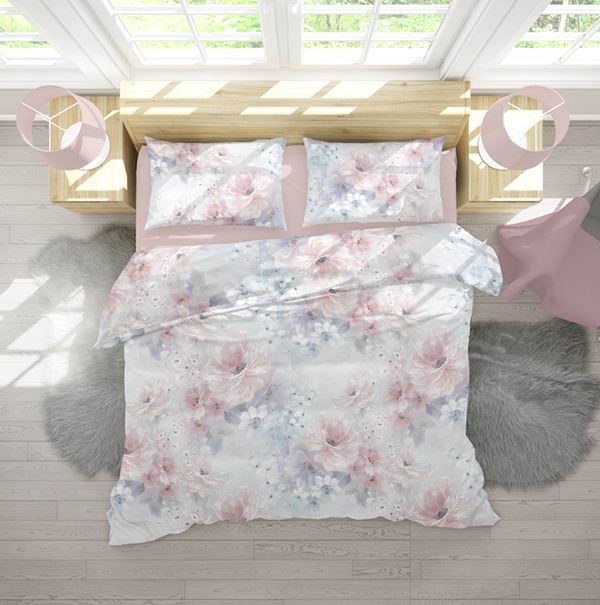 Дизайнът включва прекрасна цветна композиция от нежни цветя в сиво и цвят пепел от рози, с нежен намек на лила. Освежаващият и нежен мотив ще придаде изискана атмосфера на вашия интериор и ще добави усещане за спокойствие и релакс.