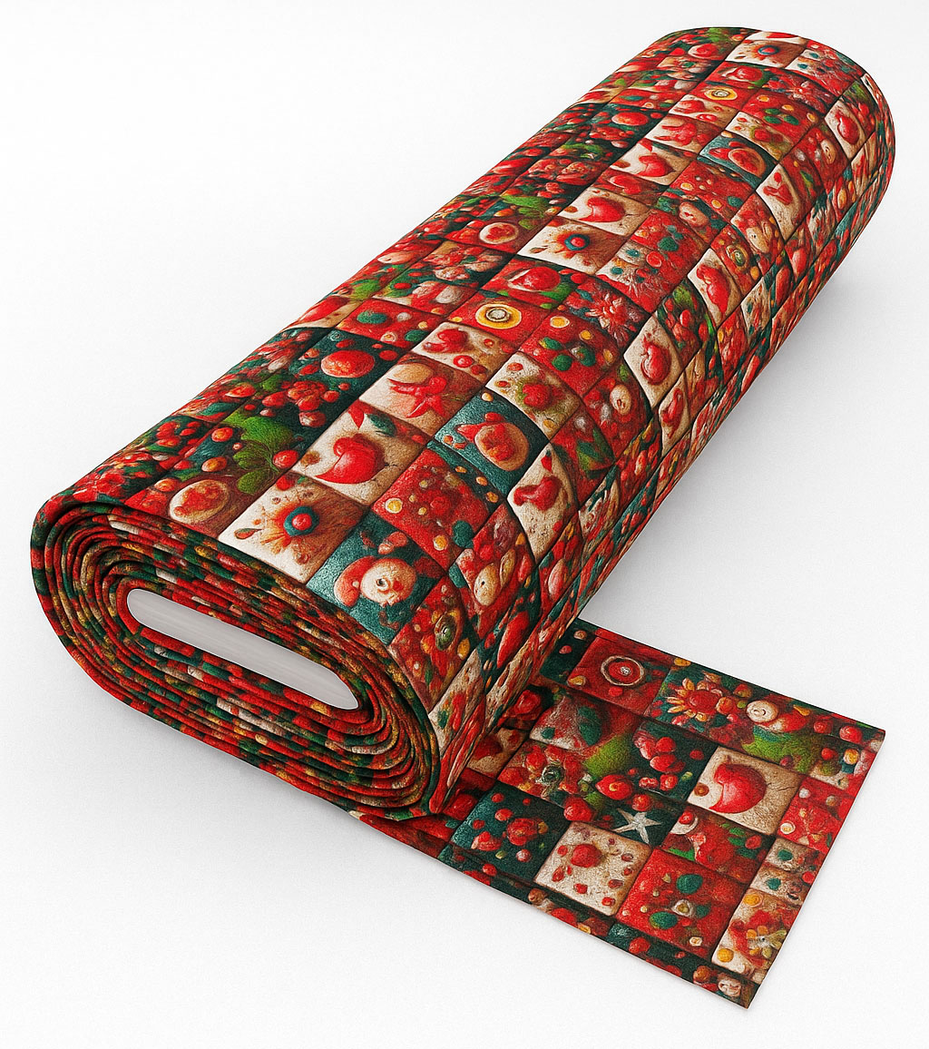 Красив коледен плат - памук и полиестер. Класическа пъстра и артистична комбинация. Тематични картинки подсилват коледното настроение върху десен, подобен на пачуърк стил в зелено, червено и екрю.