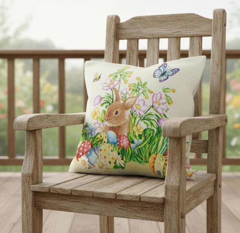Тази жакардова декоративна калъфка за възглавница с Великденски заек и боядисани яйца е изработена от плътна материя. Двустранна е. Има цип за сваляне и слагане.