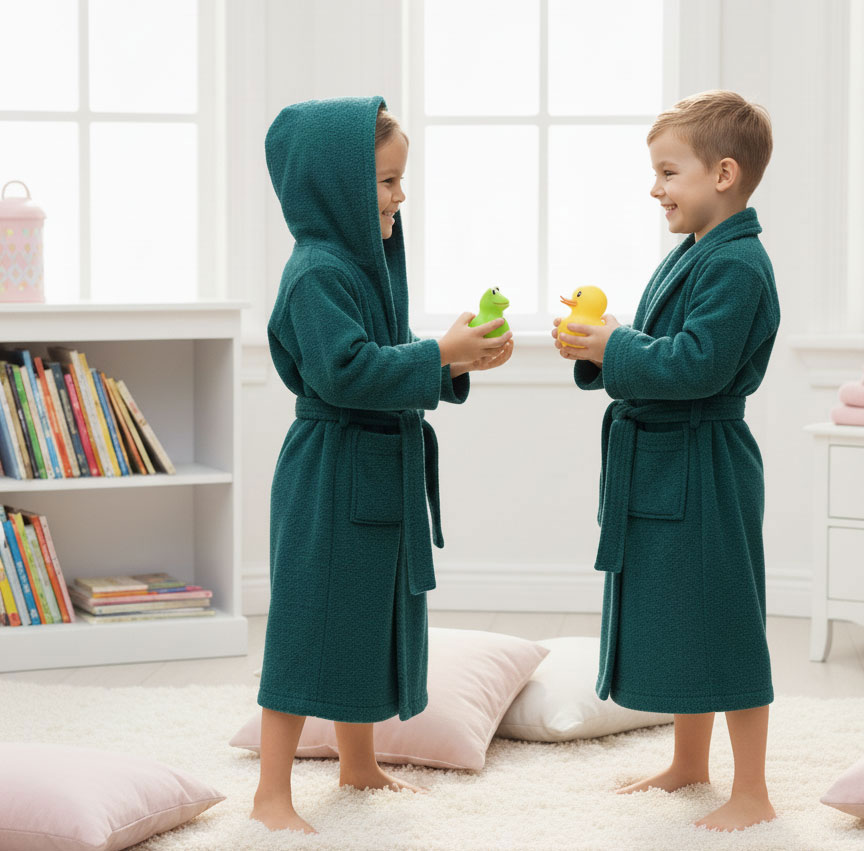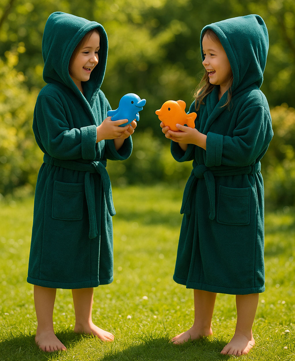 Пухкав халат за баня - за момичета и момчета. Български. Изработен от 100% памук - плътен хавлиен плат. Цветът е петроленозелен.