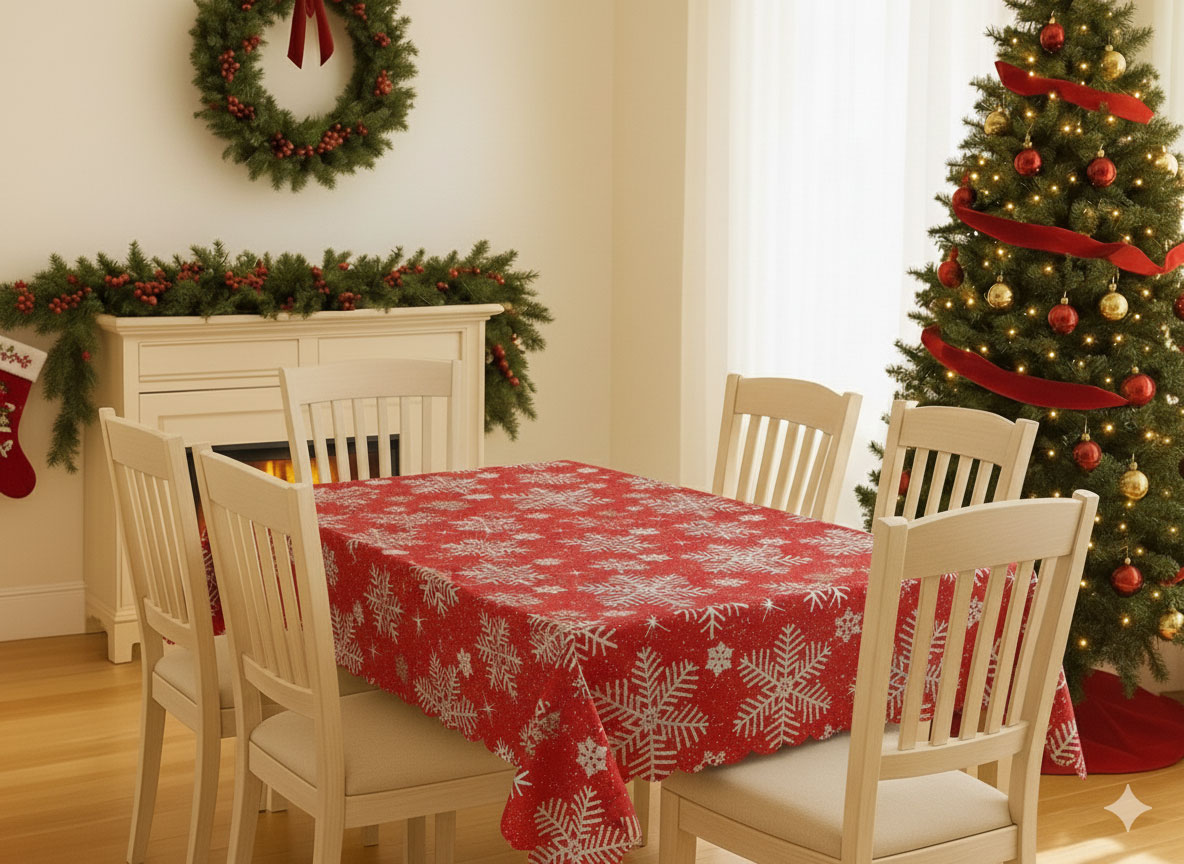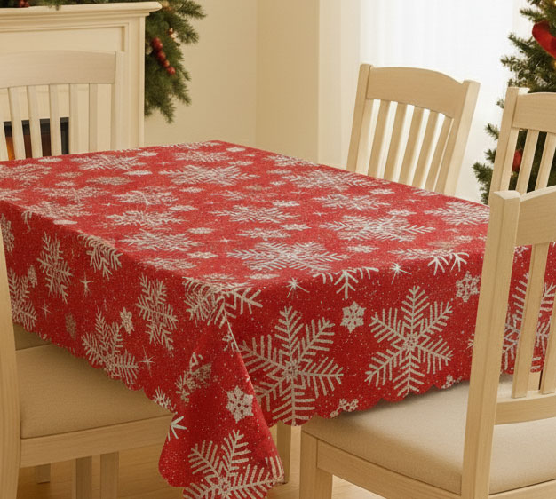 Свеж Коледен подарък за дома и семейството - покривка, която чудесно се вписва в украсата на дома при всеки декор. Коледна покривка за маса, ушита от плътен плат - 100% полиестер, със снежинки в различна форма, върху коледно червено.