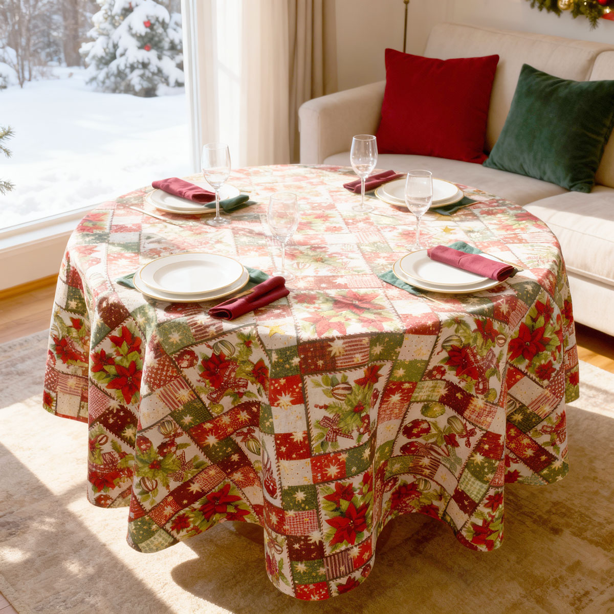 Тъмно червена коледна покривка за маса. Предлага се кръгла и елипсовидна. Подходяща за всекидневна употреба, за сервиране и за тържествени случаи. различни размери. В каталога е представена и покривка от същия плат, но правоъгълна.