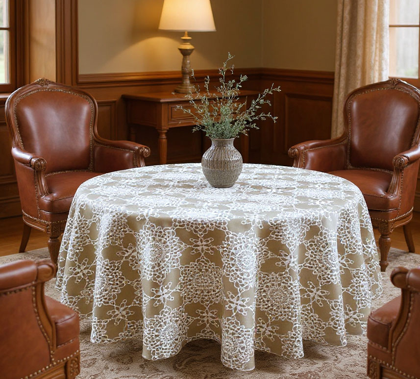 Десенът и тъканта, красивата меко падаща материя, естественият цвят капучино, съчетан с екрю, позволяват използването на покривките както за декорация, така и за ежедневна употреба.