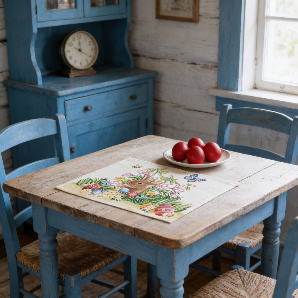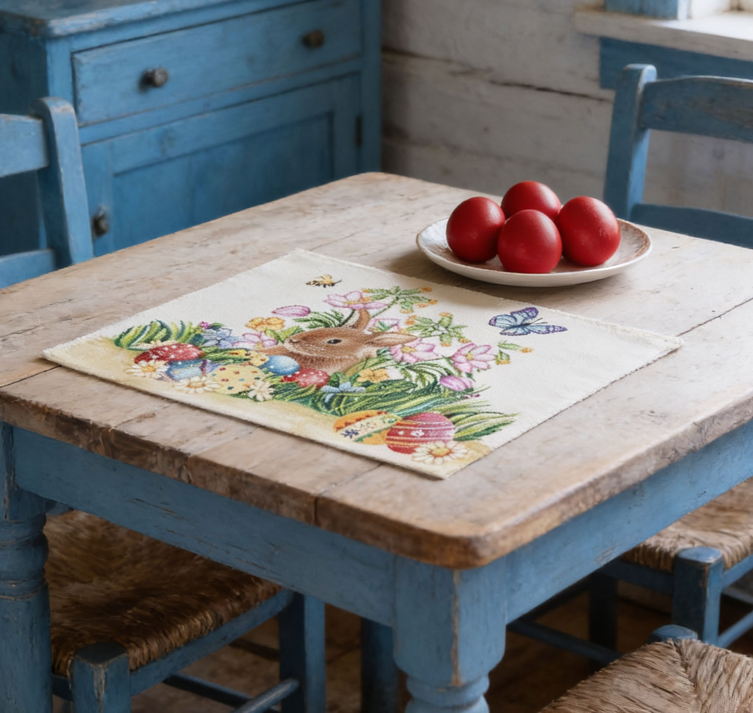 Поканете пролетта у дома с тази красива великденска салфетка - каре. Цъфнали пролетни цветя и Великденски заек - онзи неповторим пухкав розов облак, който се появява в двора още през март сега е на дивана у дома.