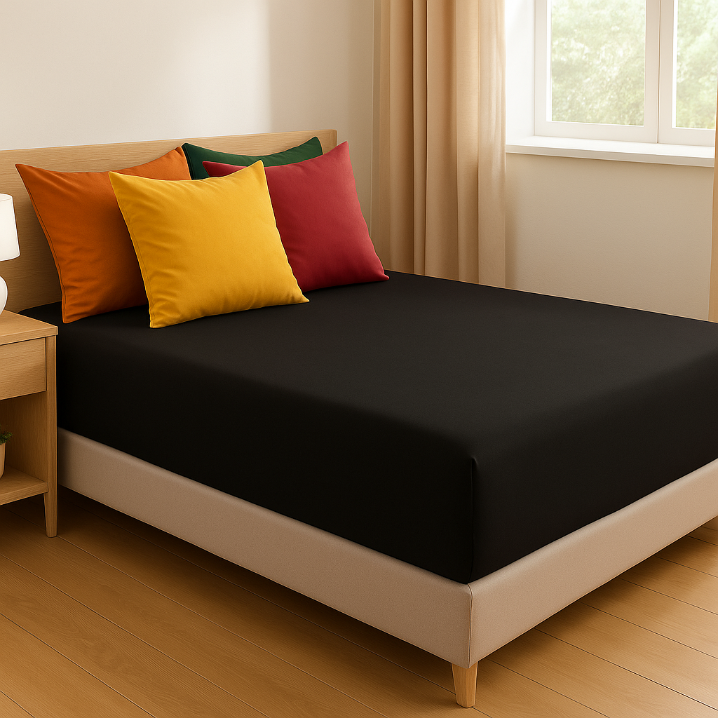 Едноцветните черни памучни чаршафи се съчетават с различен тип калъфки за възглавници и пликове.