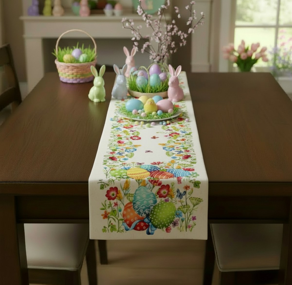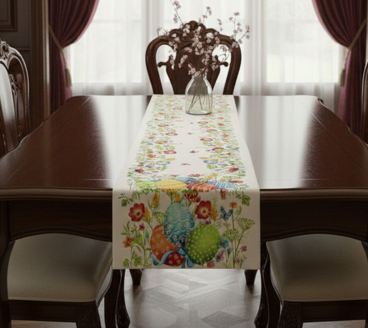Жакардова великденска покривка - тишлайфер с широк цветен бордюр. Пролетна градина с боядисани яйца украсяват масата и стаята. Цветовете на пролетта са вече в стаята.