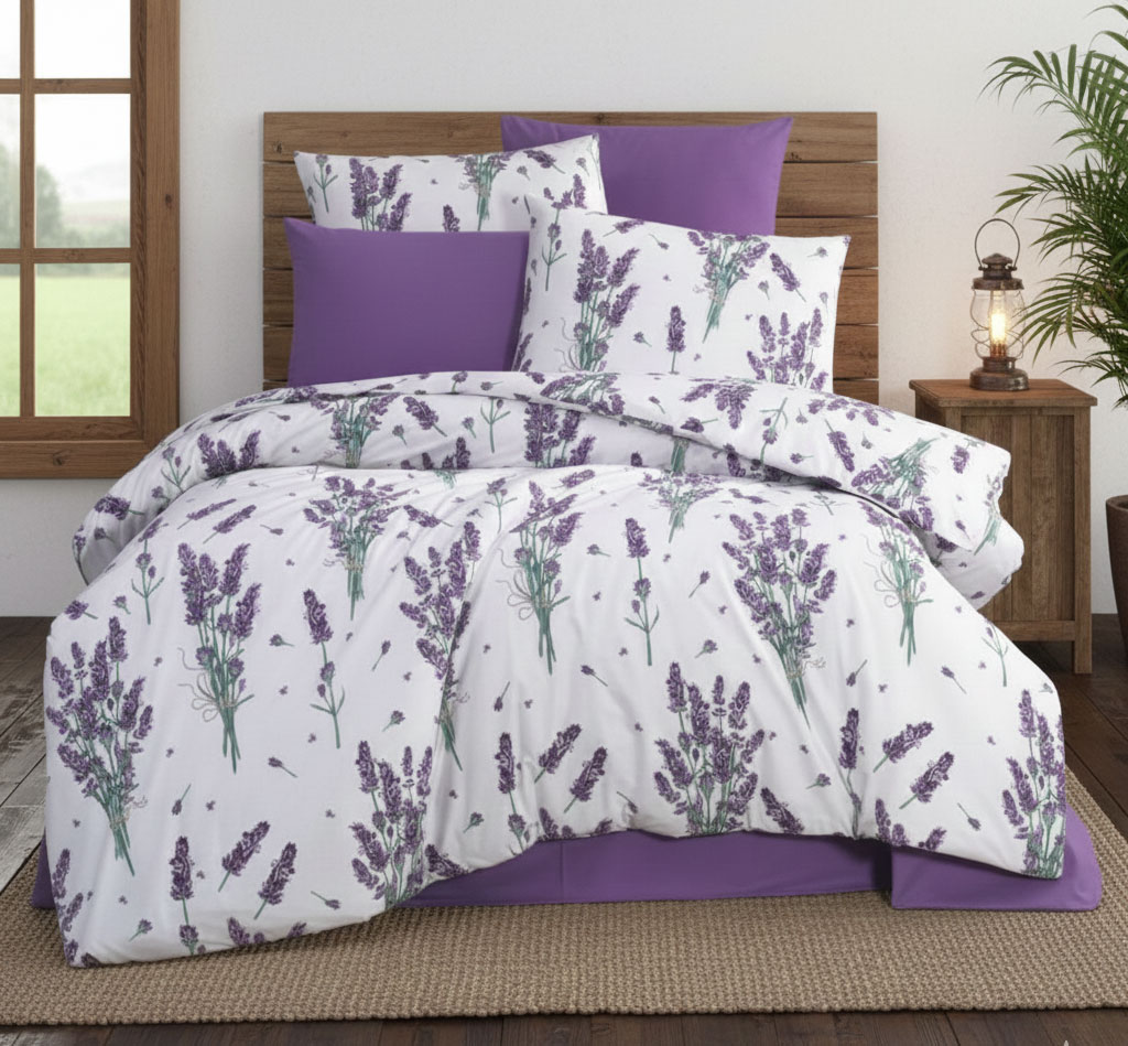 спален комплект бельо в светли лилави тонове. Бельото е ушито от плат Ранфорс: 100% памук. 57 нишки/ кв.см, ниска свиваемост 4%.