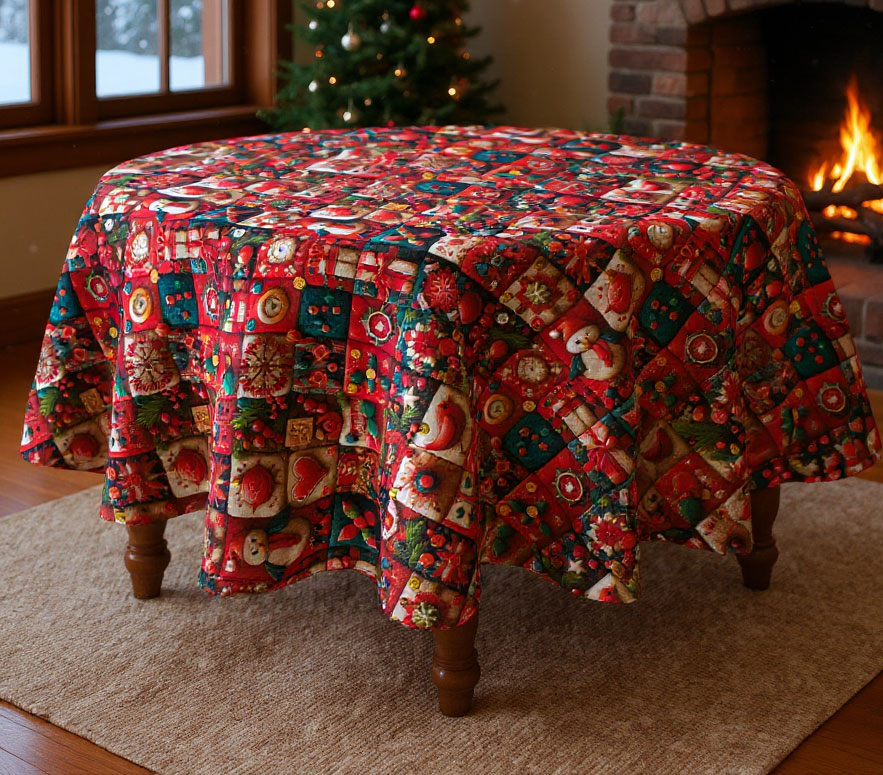 Цветовете на покривката са коледно червено и зелено в различни нюанси. Съчетава се прекрасно с едноцветни салфетки и карета, коледни свещи и друга празнична украса. Великолепно се вписва в интериор от дърво.