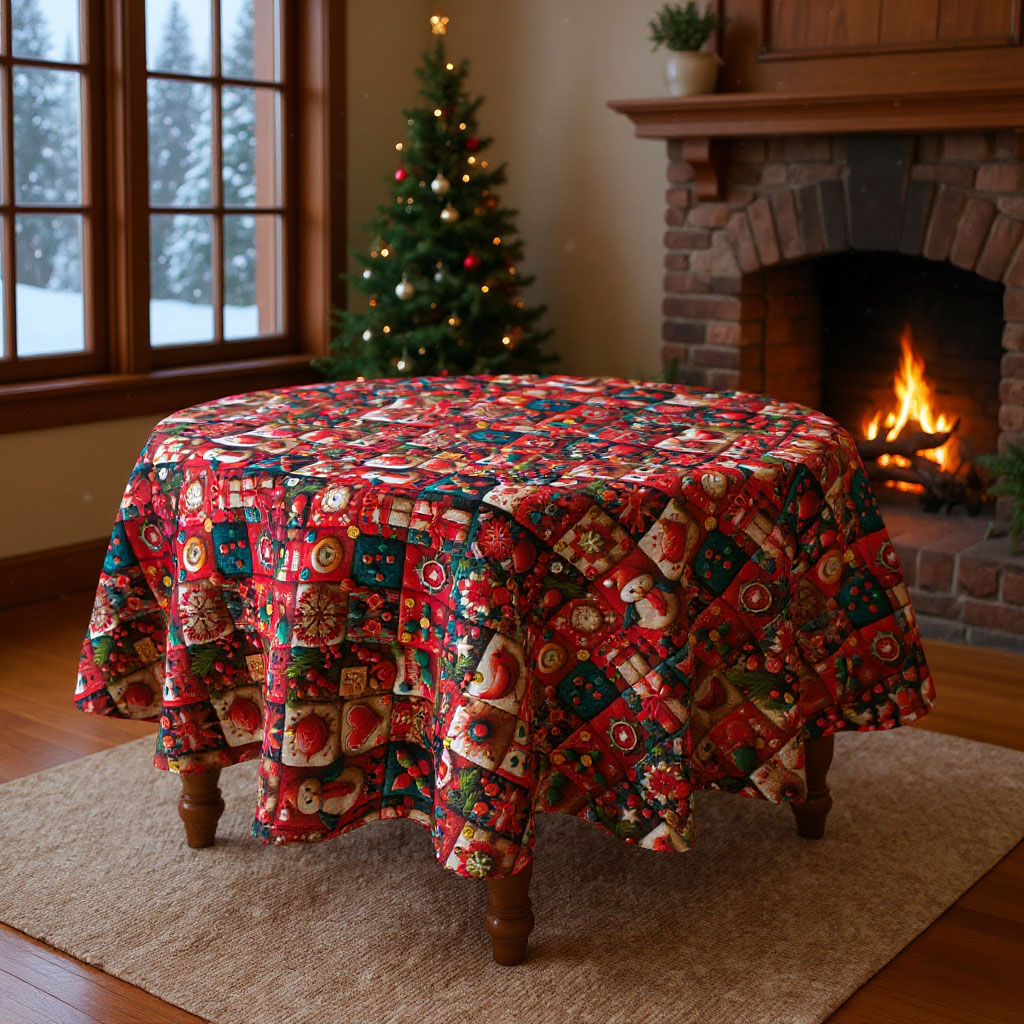 Красиво клонче от елхичка, Снежко, букетче имел, коледен подарък и други весели джунджурийки се разполагат артистично в тази красива коледна покривка за маса, подобно на пачуърк. Много много настроение и уют. Един мил подарък за всички, които планирате да дарите по Коледа и Нова година.