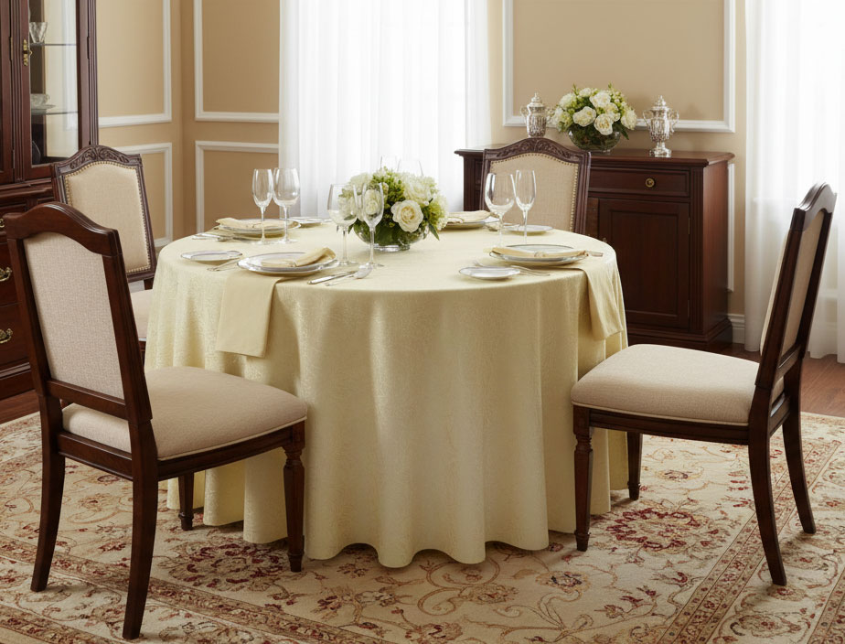 Кремава покривка за маса, която се предлага както в правоъгълен вариант с различни размери, така и за кръгла маса или под формата на елипса. Десенът и тъканта позволяват ползване с 2 лица.