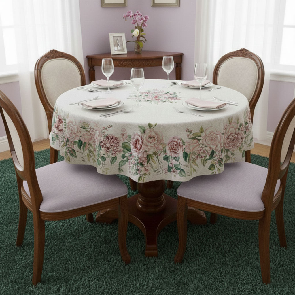 Разкошни покривки за маса, ушити от жакард. Основният цвят е екрю с барокови орнаменти. По края на покривката има много красив бордюр-венец от рози, градински цветя и клонки. Платът и формата са устойчиви при пране - препоръчва се температура до 40 градуса.