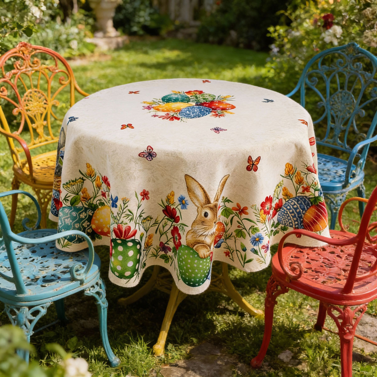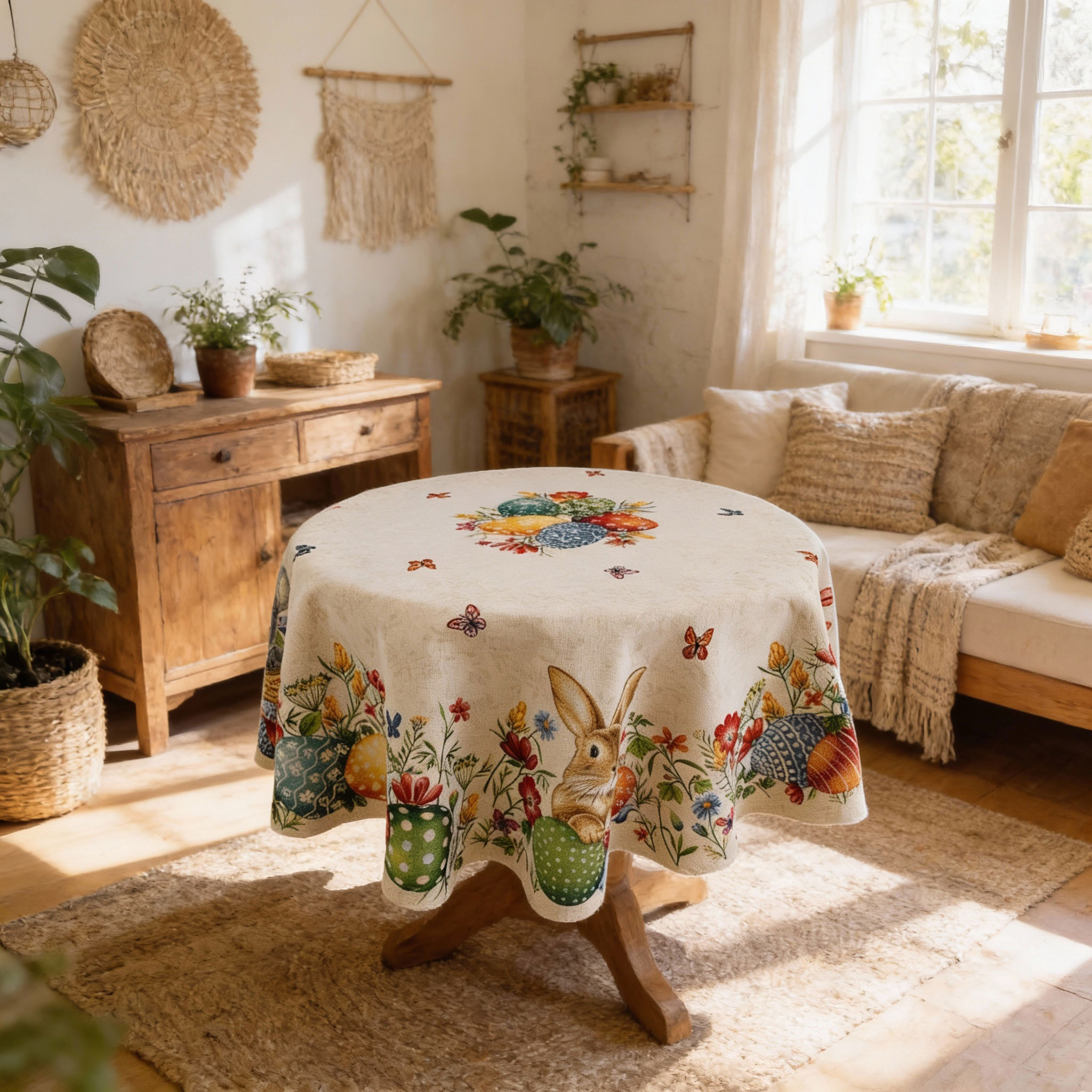 Дизайнът на великденската покривка е едновременно традиционен и елегантен. Домът е още по-красив, украсен за големия празник.