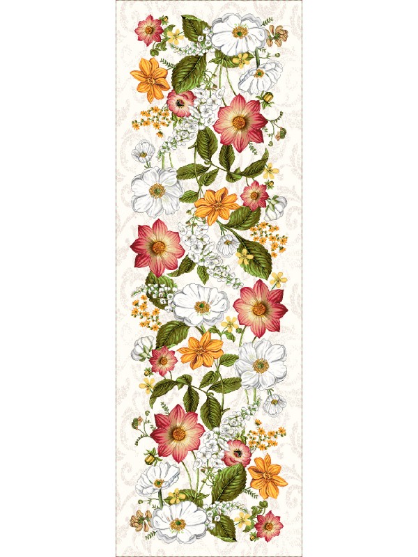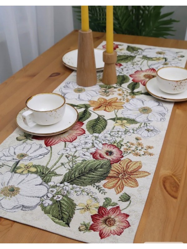 Този красив тишлайфер от жакард е истинско произведение на изкуството, пресъздаващо пролетна градина с всички нейни очарователни цветове и форми. Зелените листа и стръкове, разположени върху светъл фон, придават свежест и елегантност на всяка трапеза. Изработен от висококачествен жакардов плат, тишлайферът е не само стилен, но и издръжлив.
