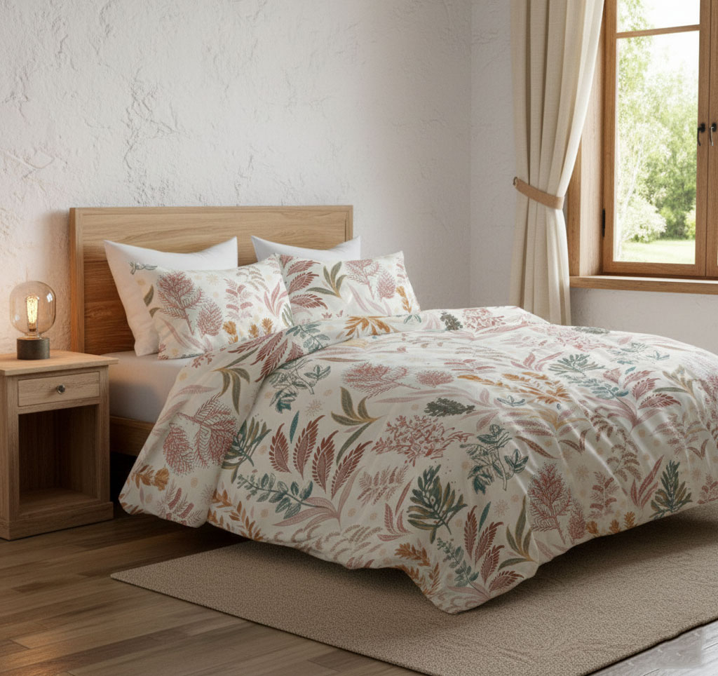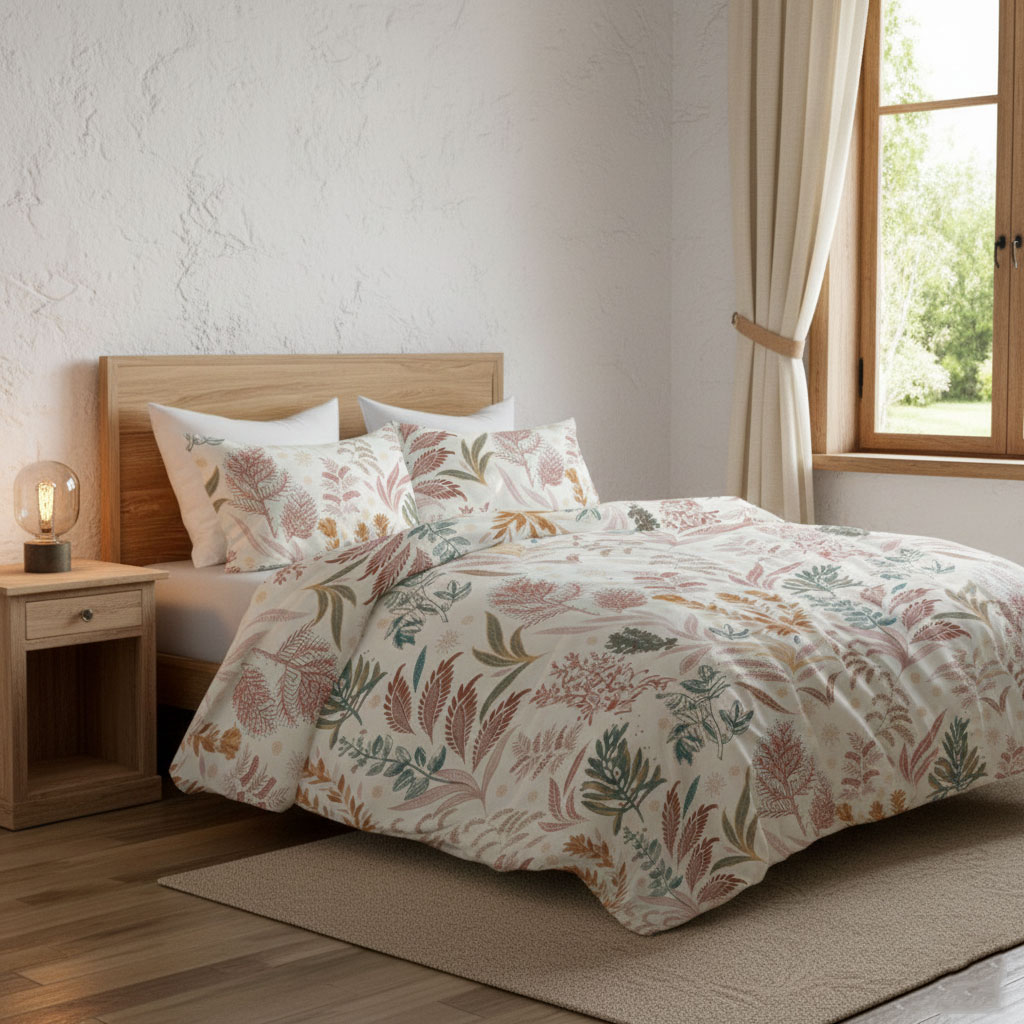Свежестта на природата се настанява в стаята с този спален комплект от памучен сатен. Слънцето влиза през прозореца, полита със слънчевите лъчи и нежно целува леглото ви. Върху чаршафи се усмихват великолепни нежни билки и цветя цветя.