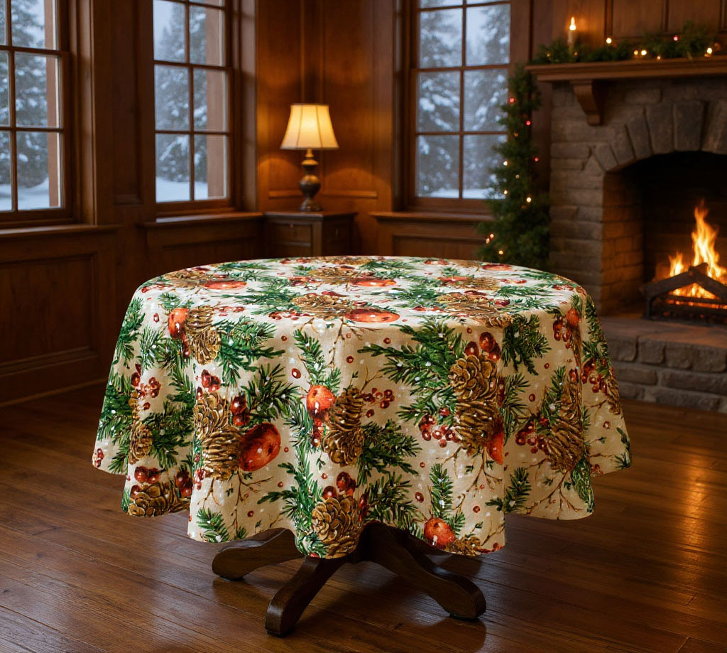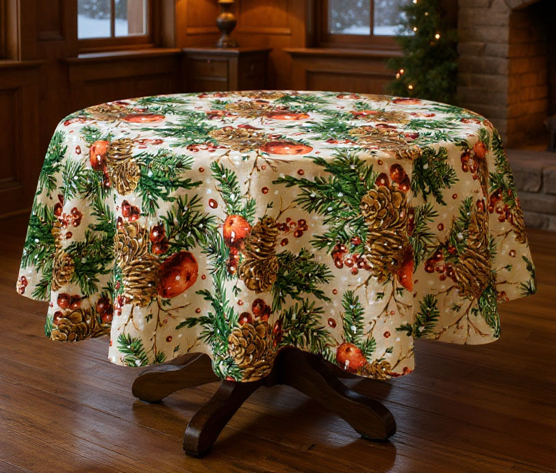 Празничната коледна покривка с елхови клонки и шишарки. Много стилно и уютно допълнение към вашата украса за Коледа и Нова година.