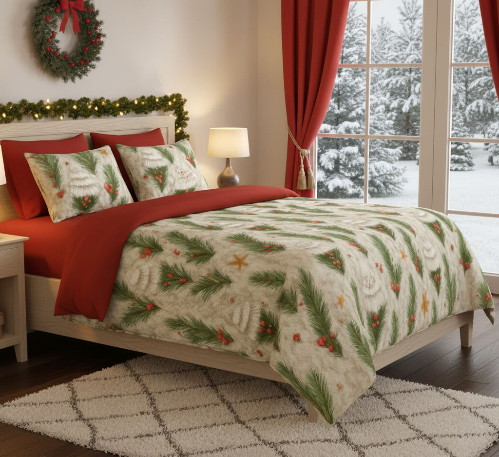 Коледният спален комплект В елховата гора е създаден за хора, които ценят елегантния зимен декор, природното вдъхновение и високия комфорт. Десенът съчетава нежни зимни мотиви — реалистични борови клонки, снежни текстури - представени в топла, природна палитра, която носи спокойствие и празничен дух без излишна натрапчивост.