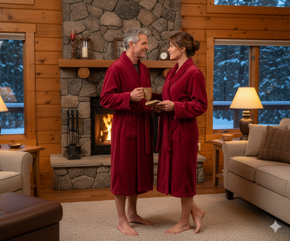 Домашен халат от микрофибър, подходящ за мъже и за жени във всяка възраст. Бордо - раазошен плътен цвят. Материята е пухкава и мека, 100% полиестер. Приятна на допир и топла.