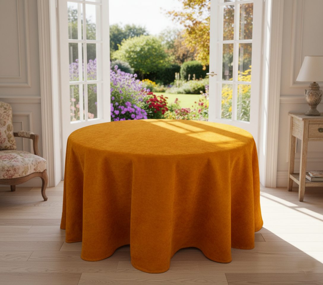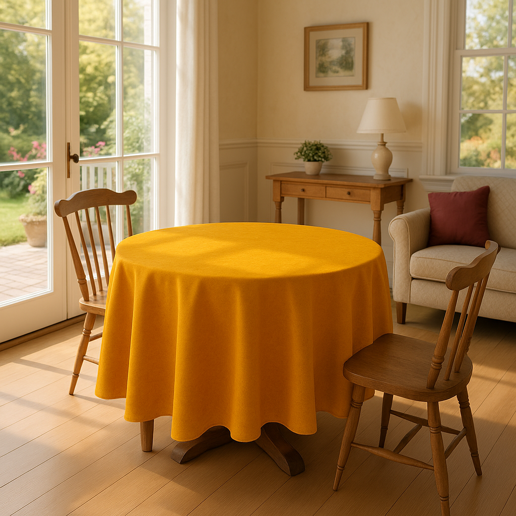 Стаята ще грейне с тази луксозна покривка за маса от чудесна плътна материя. Едноцветна и тържествена, ярко жълта - горчица.