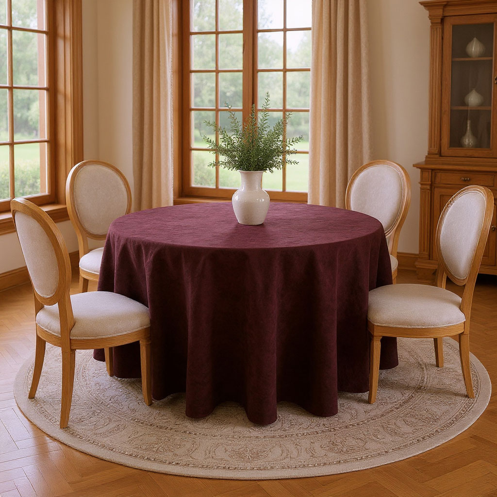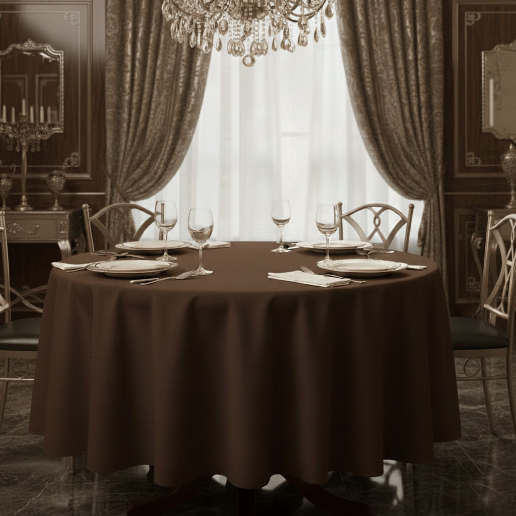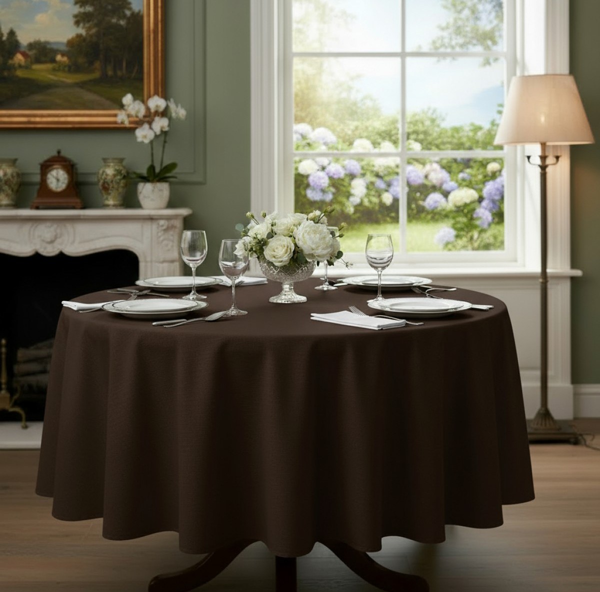 Едноцветна покривна за маса - тъмнокафява. Актуалният цвят за всички годишни времена, предпочитан от много домакини. Комбинирайте с жълто, или бледолилаво и бяло, и пролетта ще влезе в дома ви. Сложете каре или тишлайфер с ярки цветове и лятото ще е у вас. За есенните цветове коментар не е нужен! Те са класика.