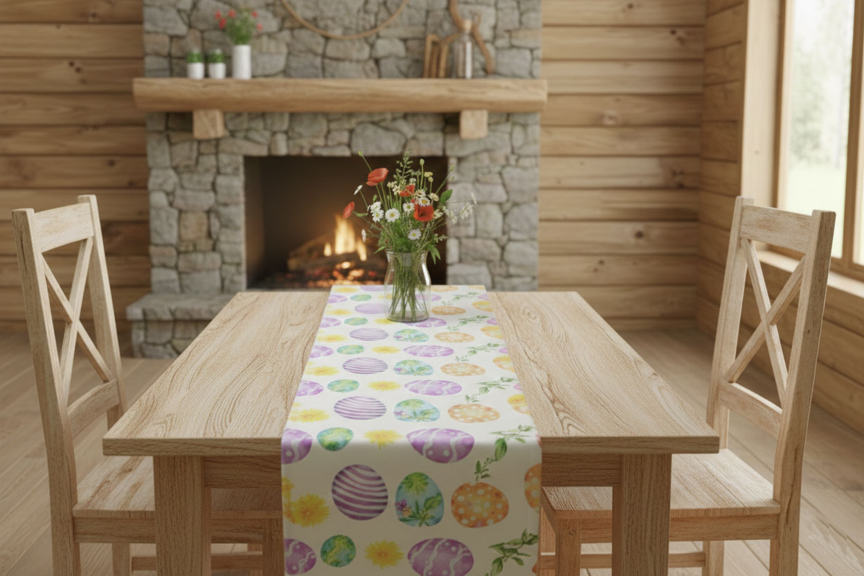 Великденски покривки за маса - тишлайфер с пъстра щампа с тематични картинки. Боядисани яйца, глухарчета и теменужки са разположени артистично върху плата.