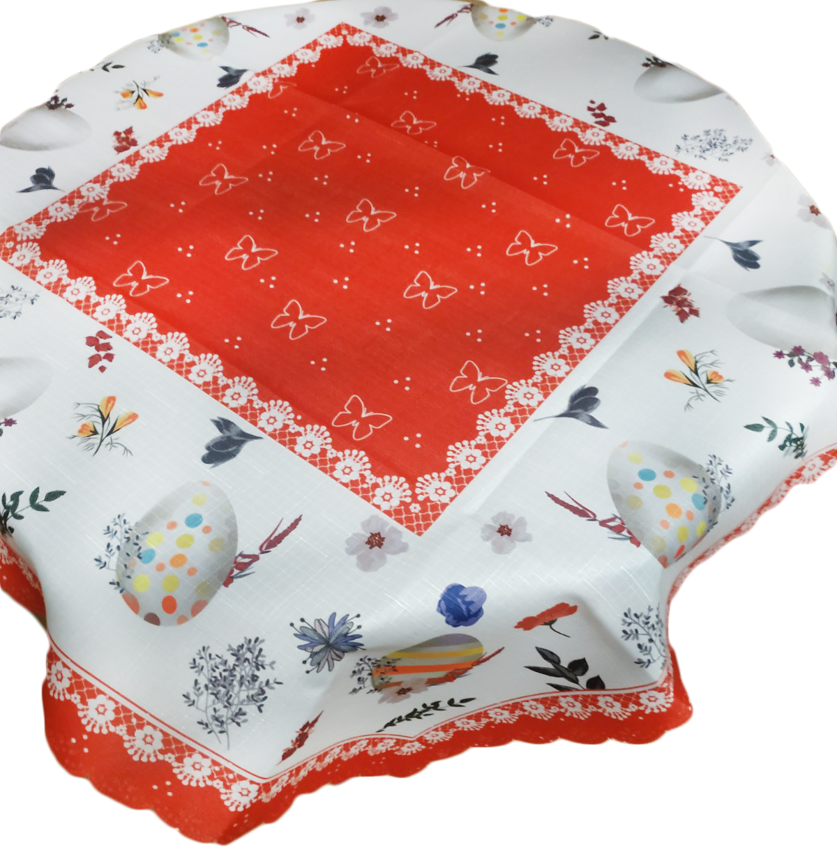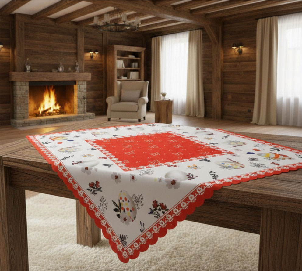 Великденско каре с тематични фигури и много червено. Нежна ивица, подобна на дантела е щампована като оформящ бордюр. Карето е леко и елегантно. То се вписва в интериора - както вкъщи, така и в заведения.