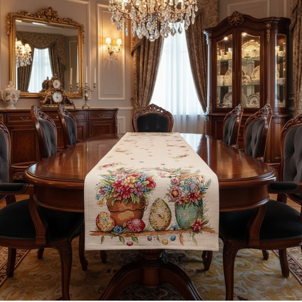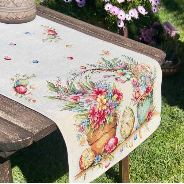 Ушит е от жакардов плат, който е комбинация от памук и полиестер. Поддържа се лесно. Пере се до 40 градуса. Подходящ е за вила или тематични подредена стая, както и за малки уютни заведения.