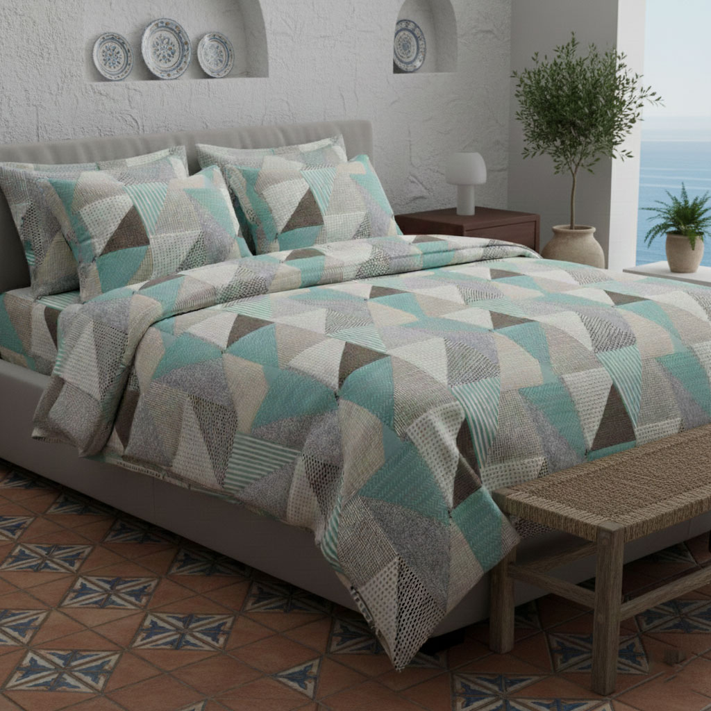 Съчетайте този спален комплект от памучен крепон с едноцветни калъфки за възглавница от ранфорс или крепон. Допълнете елегантността на спалнята с бледосиви завеси или плътни пердета цвят мента.