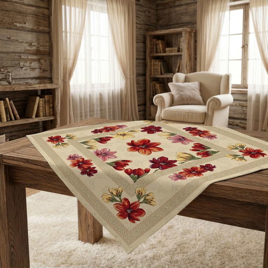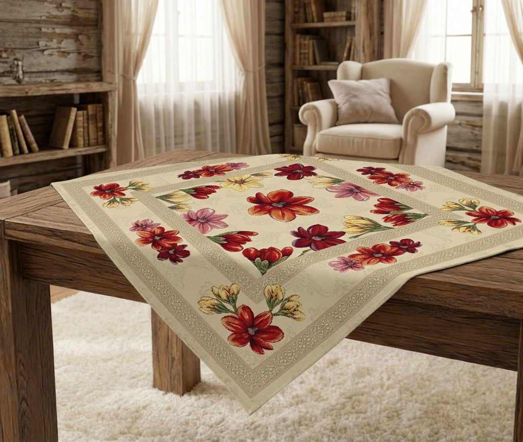 Жакардово каре за маса с градински цветя в пастелни цветове с акцент бордо. Фонът е неутрален, екрю.