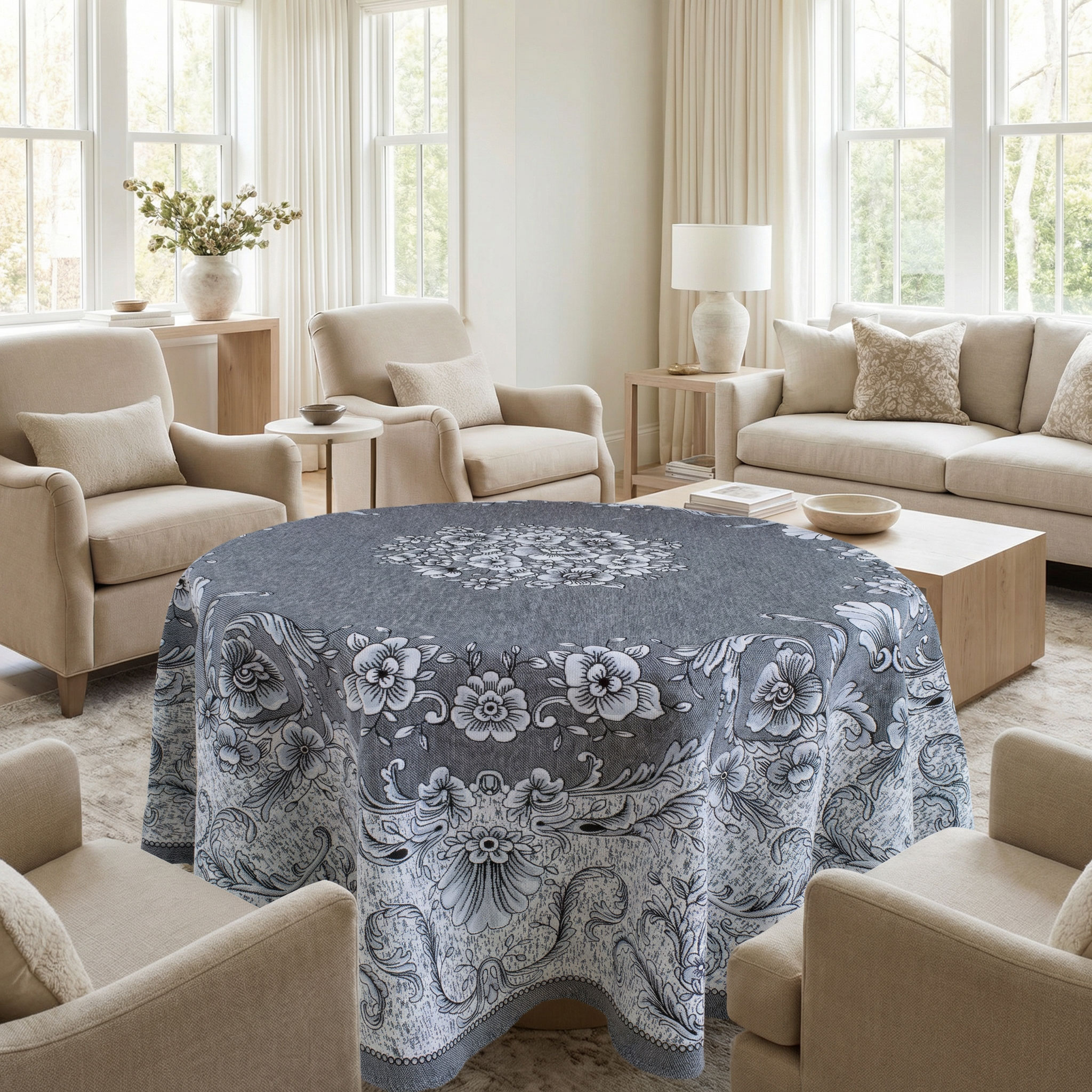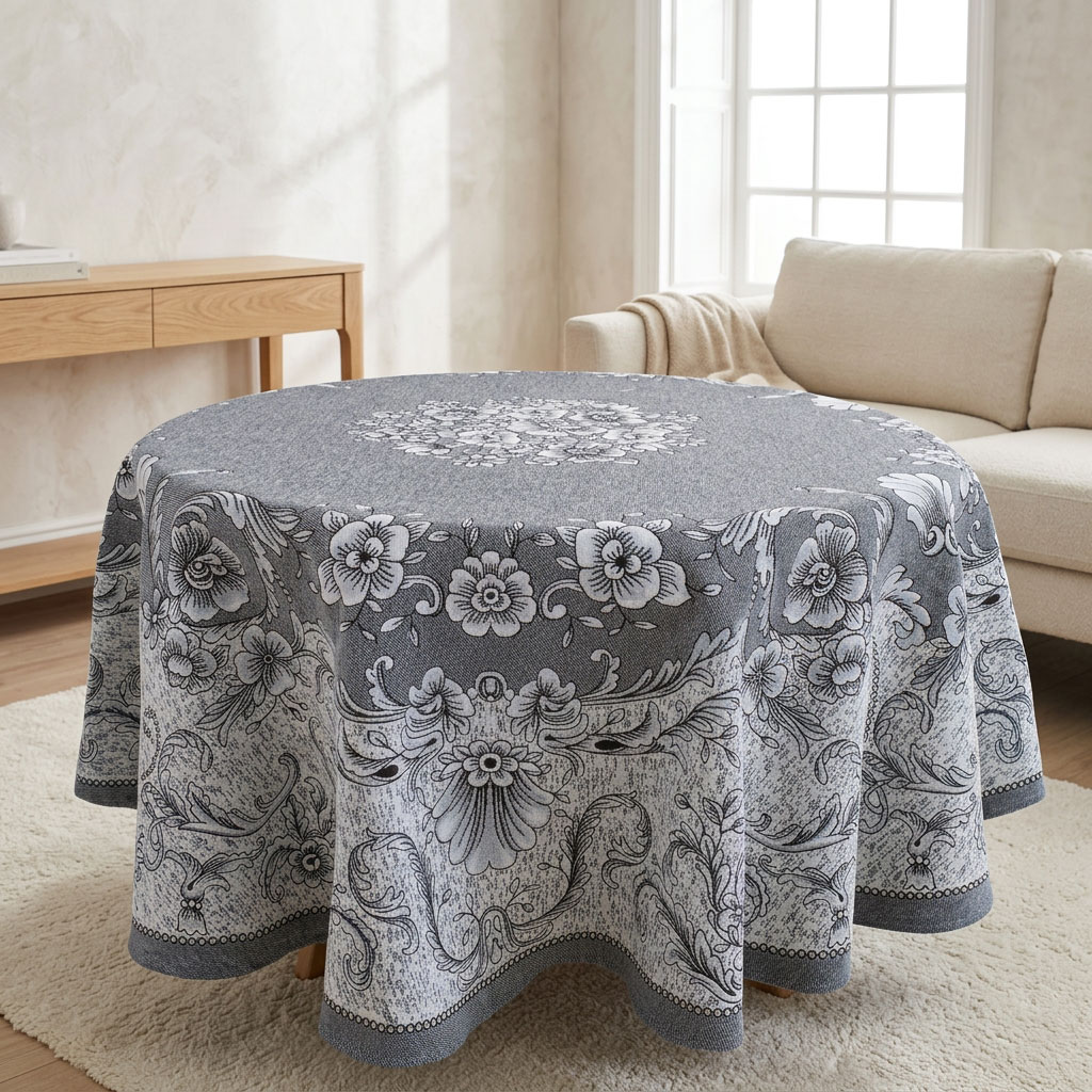 Луксозна сива покривка за маса от жакардов плат. Съчетават се с интериор с черно-бели акценти, с големи ярки петна. Покривката е красива, решена с концентрични венци и широк артистичен бордюр.