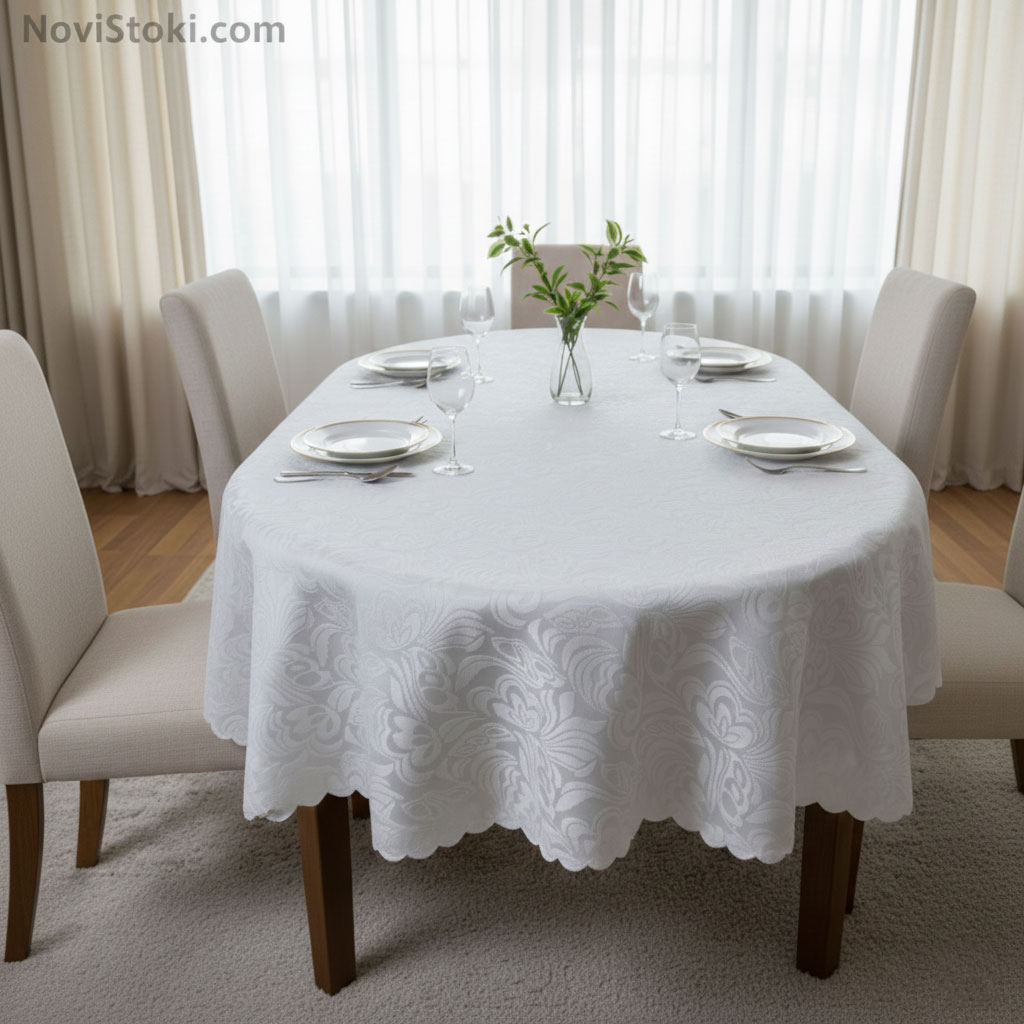 Покривката се предлага във варианти за правоъгълна, елипсовидна и кръгла маса.
