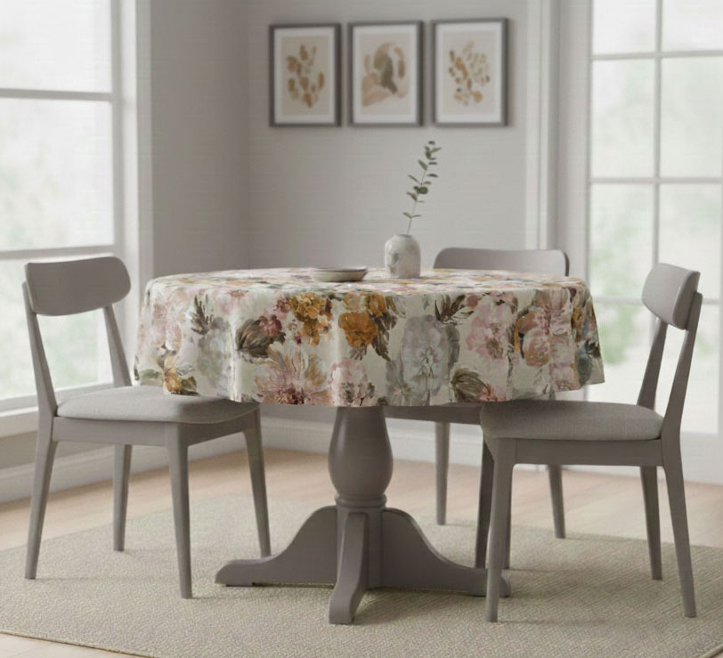 Красива покривка за маса с аристократична винтидж комбинация от цветове. Водоустойчив плат, който е с едри приказни цветя в бежово, млечно сиво и пепел от рози. Максималната ширина на водоустойчивия плат е180 см.
