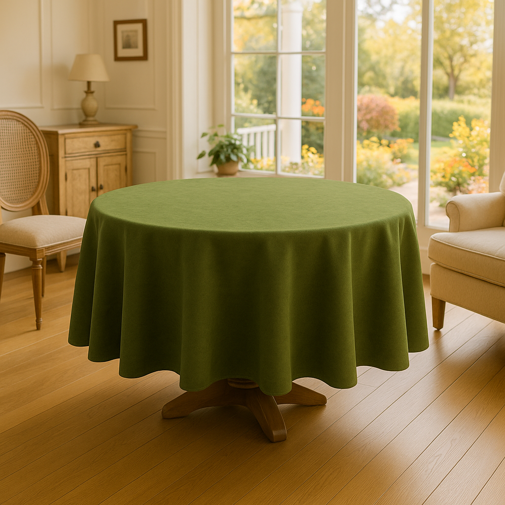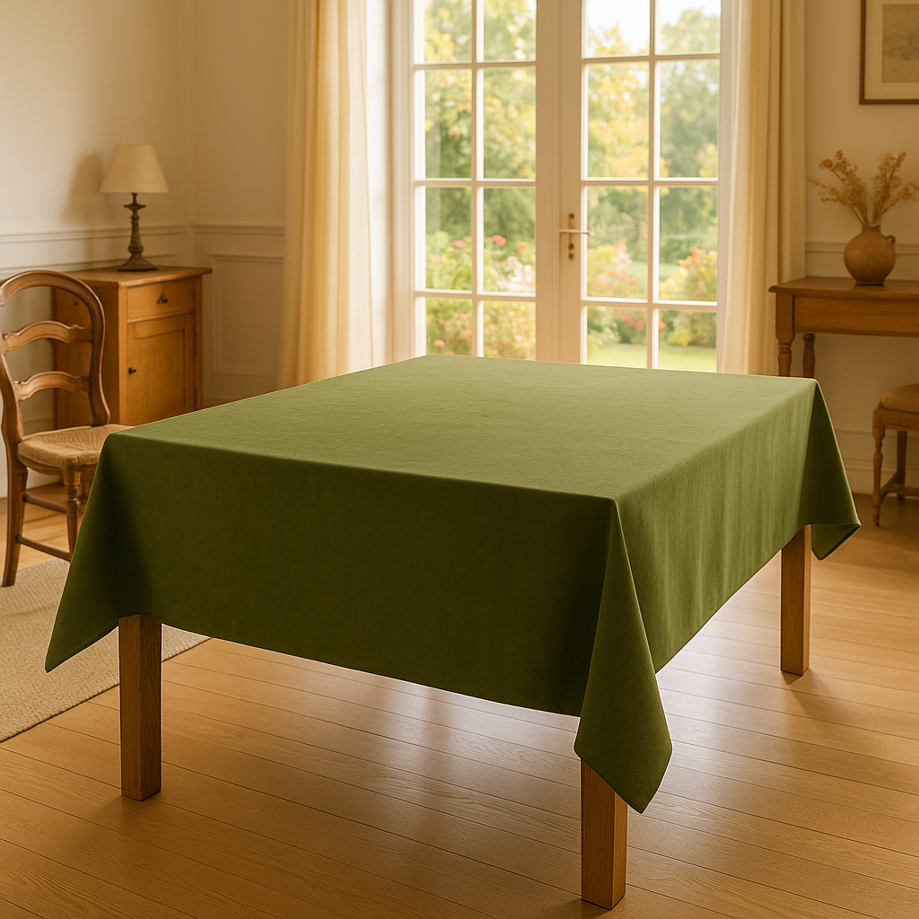 Изискана масленозелена покривна за маса от плътна материя. Цветът е подходящ за интериор, решен в светли тонове или с мебели от масив.