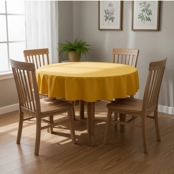 жълта покривка за маса от водоустойчив плат е универсална и може да бъде съчетана с разнообразни прибори за хранене и разноцветни салфетки, с