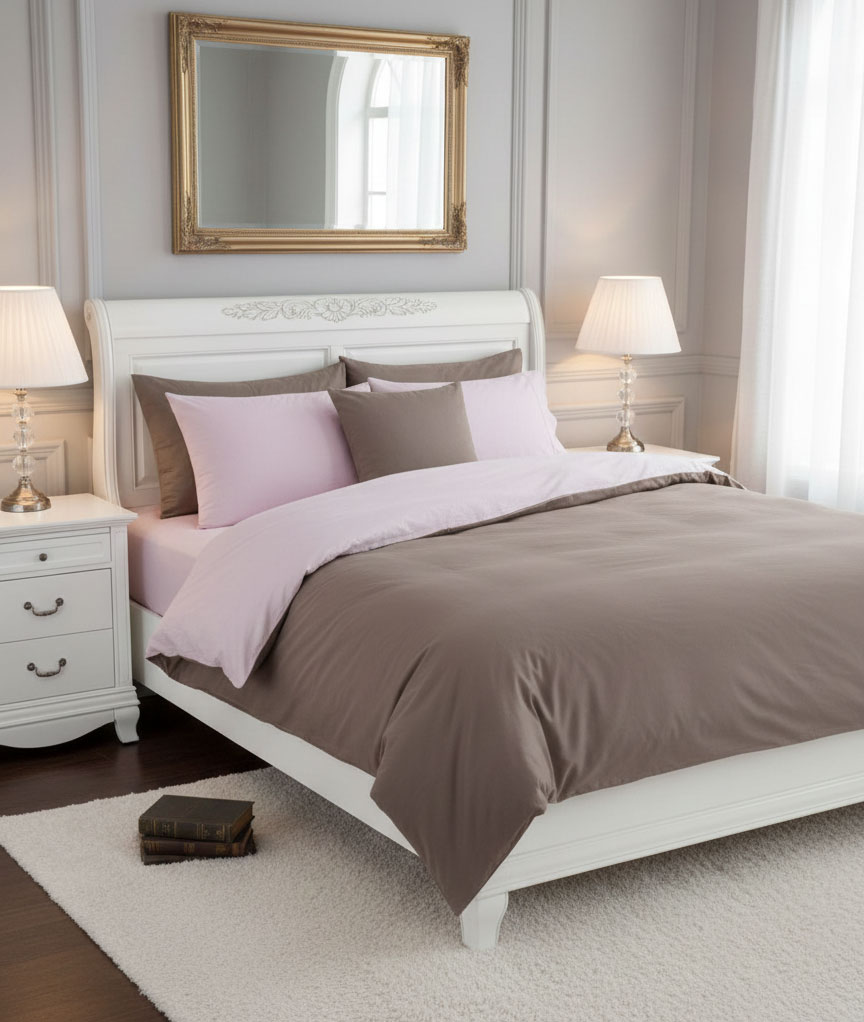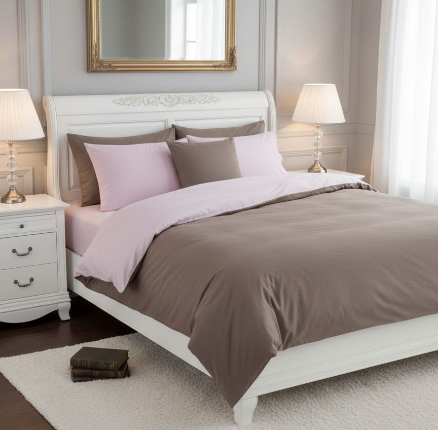 Класически спален комплект от фин памучен плат. Меки неутрални тонове - капучино и светлолилаво, перфектен шев - чаршафи, ушити са от висококачествен ранфорс.