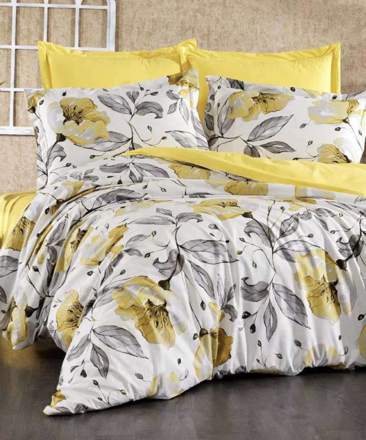 Привлекателен спален комплект от памук ранфорс - едри жълти цветя и сиви елементи.
