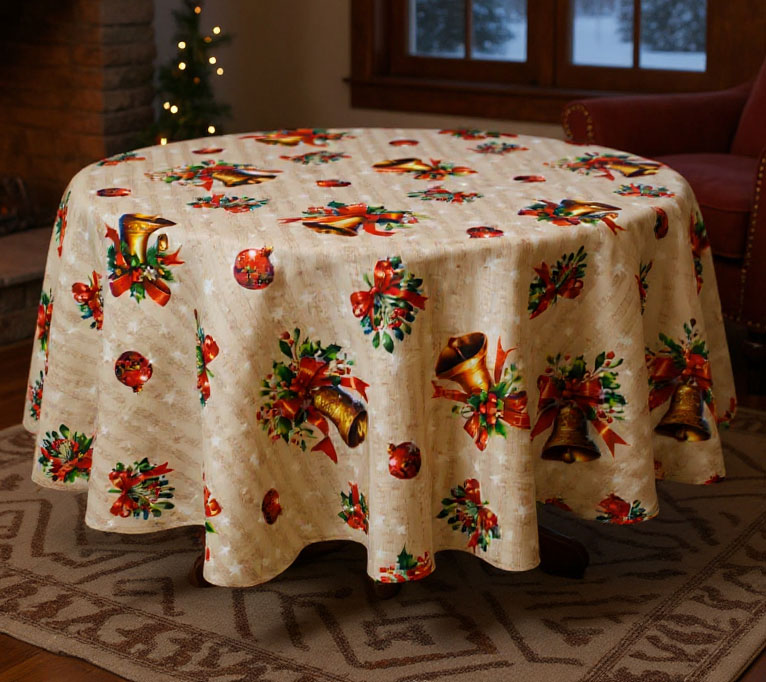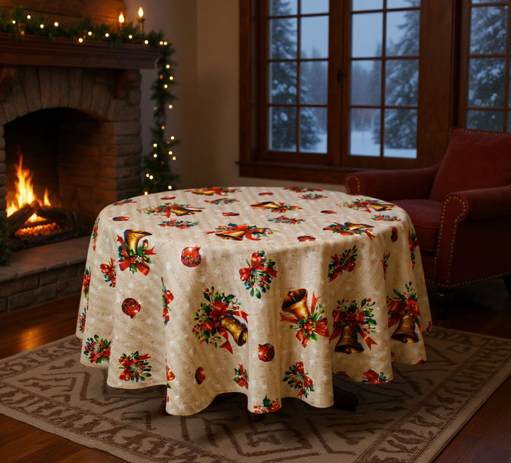 Весела коледна покривка за маса, винтидж. Красиви златисти камбанки и имел за обич и симпатични ноти на петолиния танцуват по разкошния плат и носят щастие вкъщи. Цветовете са прекрасни - млечни, комбинирани коледното червено и зелено.