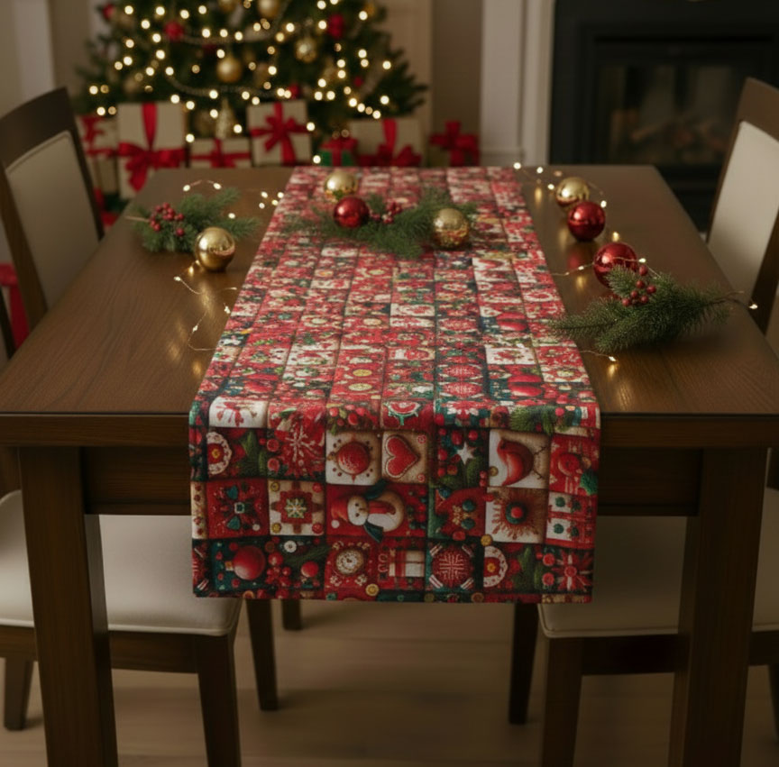 Тишлайфери в разкошни традиционни коледни цветове и тематични фигури. Насладете се на съчетанието от украсени елхови клонки, ябълки, позлатени орехи и малки торбички с подаръци на разкошния плат за коледни покривки.