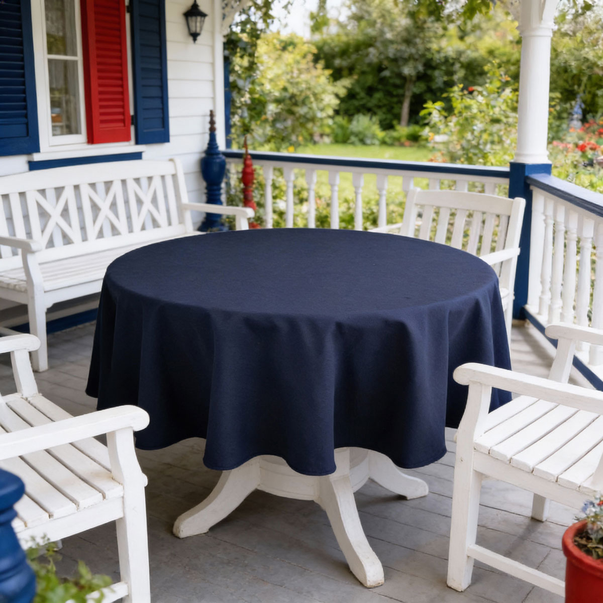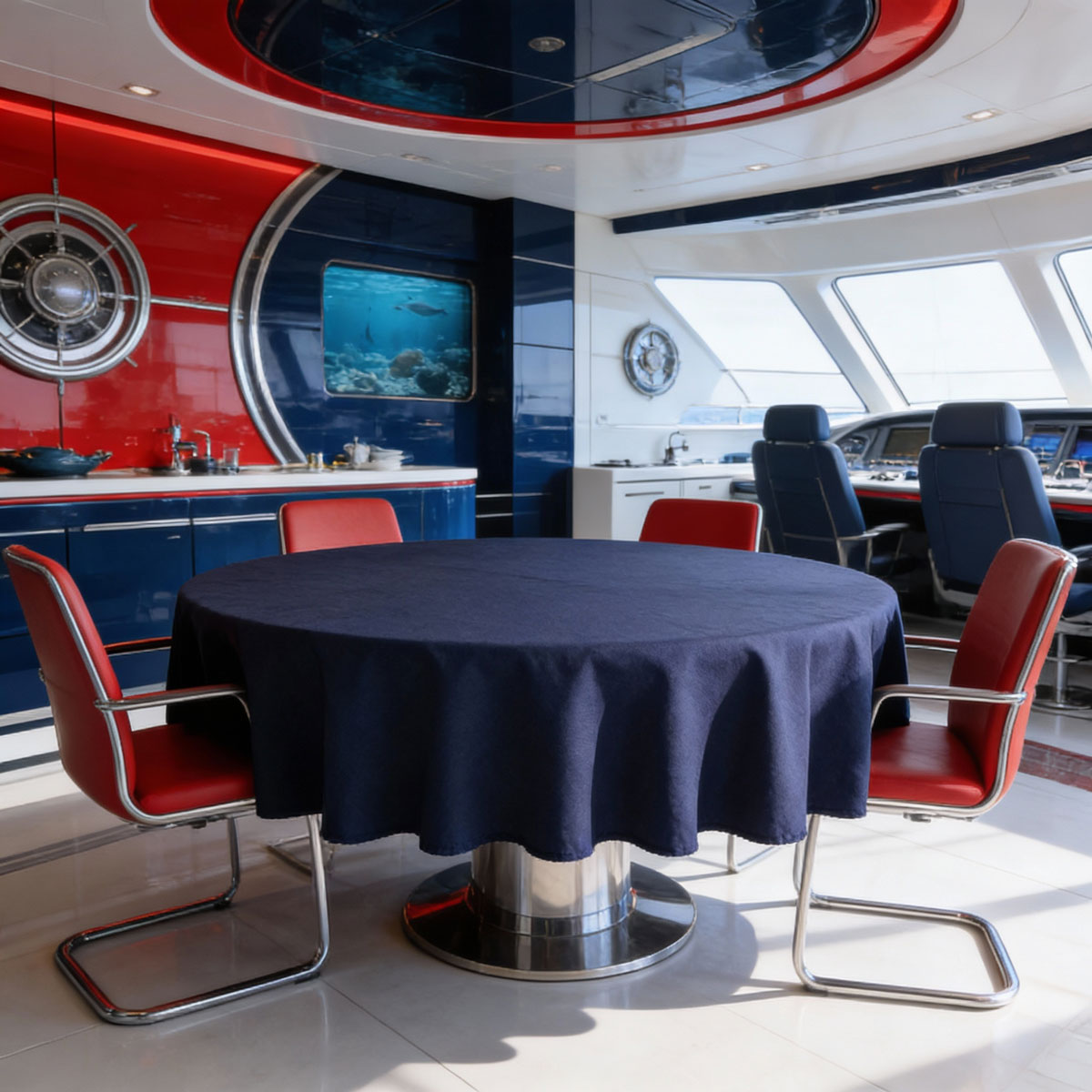 Елегантна тъмносиня покривка за маса от водоустойчив плат - подходяща за хол-трапезария и за заведение. Покривката е подходяща за съчетаване със светли мебели или такива от стъкло и метал.