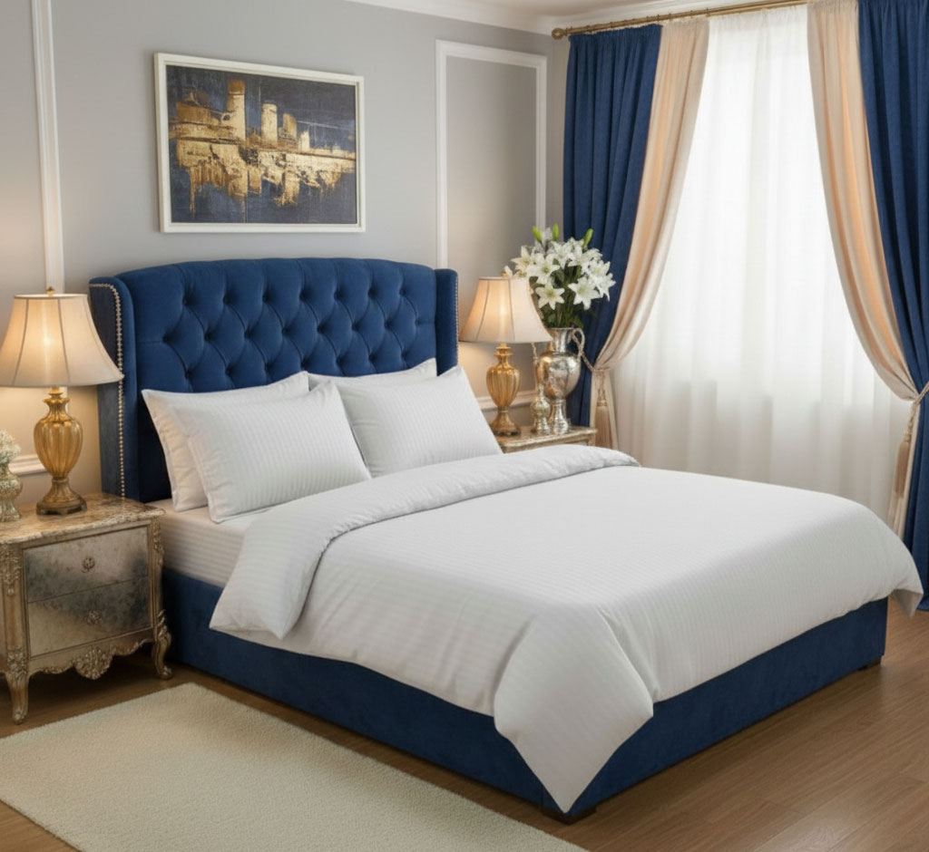 Едноцветен спален комплект от памучен сатен - бял. Десенът е загатнато тънко рае - елегантно и привлекателно. Дава мекота и усещане за нещо специално. Подходящ подарък за младоженци или за годишнина от сватба.