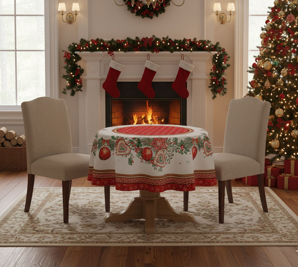 Цветовете - екрю, червено и зелено са съчетани по прекрасен начин. Коледната покривка се превръща в акцент у дома. Елегантността и класиката в нея я правят абсолютно достатъчна за украса на дома в празничните дни.
