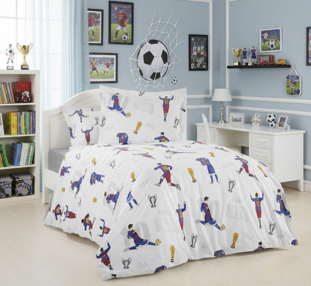 Актуален детски спален комплект с футболисти - червени и сини. Светли цветове, които напомнят двата български гранда. Чаршафите са високо качество, от памук - ранфорс.