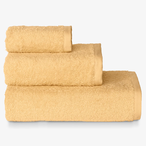 Комбинирайте размерите на жълти хавлии. Цветът е подходящ за допълване на интериора на баня с плочки в плътни земни цветове или с флорални елементи.