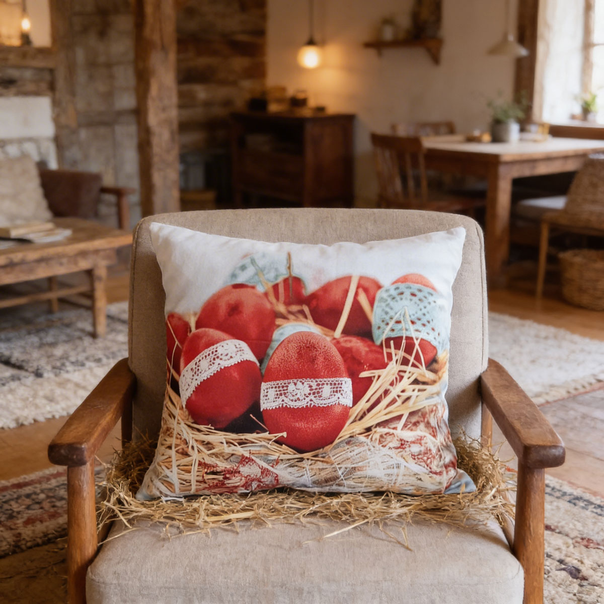 Калъфката се предлага като допълнение към великденската украса на дома. Подходяща е както за хола и дневната, така и за детска стая и веранда.